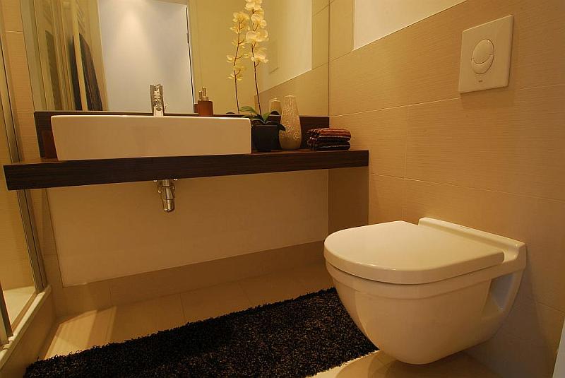 stylisch mit Dusche, WC, großem Waschbecken und Spiegel